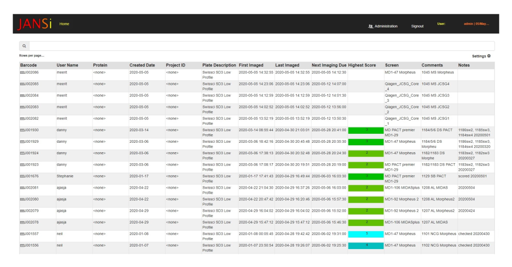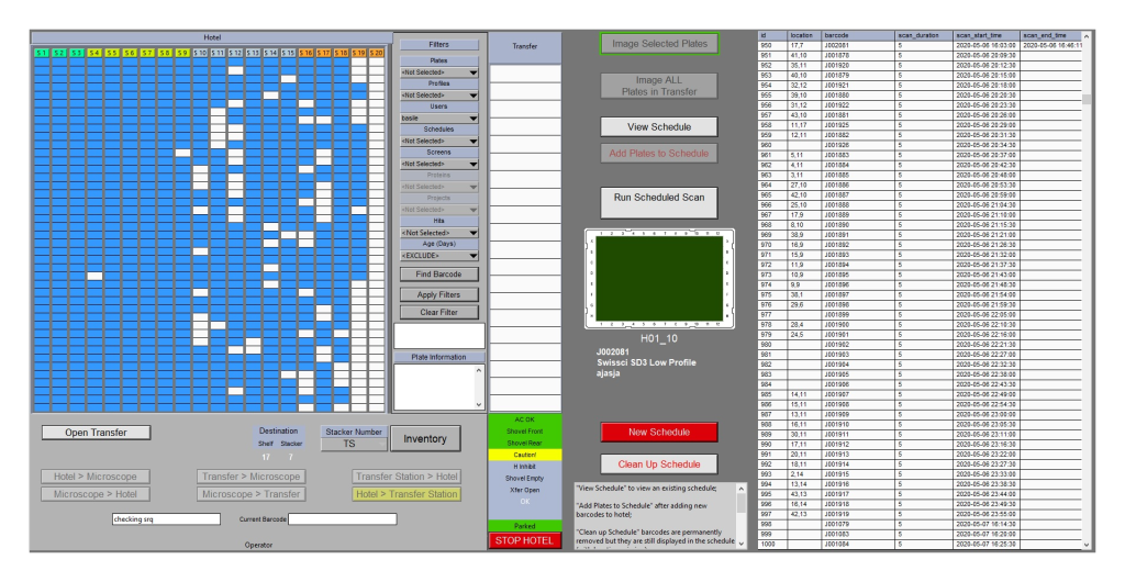 In plate hotels the occupied locations are color coded to indicate if their residents are in the scan schedule, have not yet been added to the schedule, or have been through their full schedule, whether they have been marked for one time imaging, etc. Plates that don’t need to be stored or that may not fit in the storage racks can be moved to the microscope from the loading port and imaged. Users can search for plates using many criteria, including barcodes, which makes plate management a breeze. Multiple buttons allow users to move plates, image or remove from storage. Third-party barcodes are easily incorporated into the database via a user-friendly settings panel.