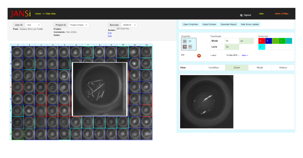 PlateView provides overview of the entire plate and in DropView, subwells can be inspected in greater detail, and zooming; brightfield and UV images can be overlapped, and interesting features can be measured. Drop history and individual slices can be viewed. Drops can be scored and searchable, well-level comments can be added. Reports can be generated for record keeping and presentation.